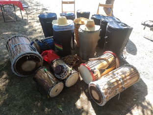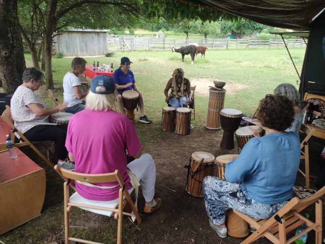 Bei gutem Wetter trommeln wir im Freien an einem sehr schönen Platz und in einem schönen großen Ausweichraum drinnen bei Schlechtwetter, wenn nötig. Wir spielen 4 bis 5 verschiedene Rhythmen aus